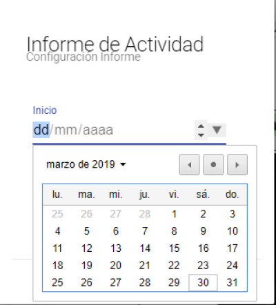 Desde el icono de impresión ubicado en el margen inferior izquierdo podemos obtener un Informe de Actividad, donde seleccionado previamente el intervalo de fechas a visualizar, obtendremos dicho informe.